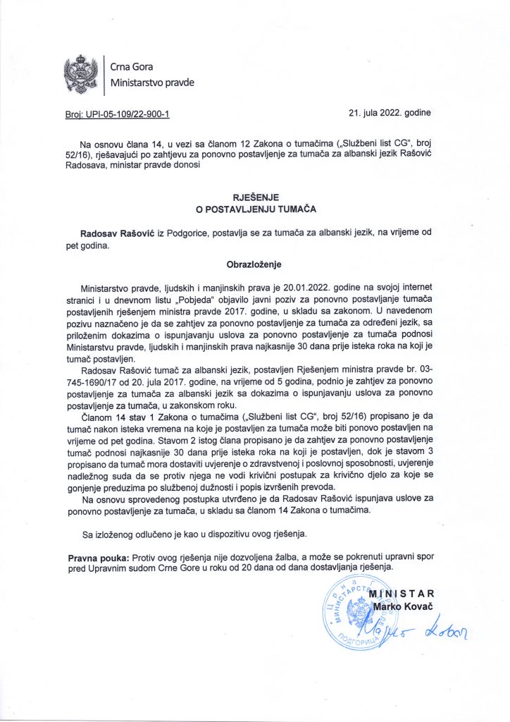 Radosav Rašović, sudski tumač za Albanski jezik
